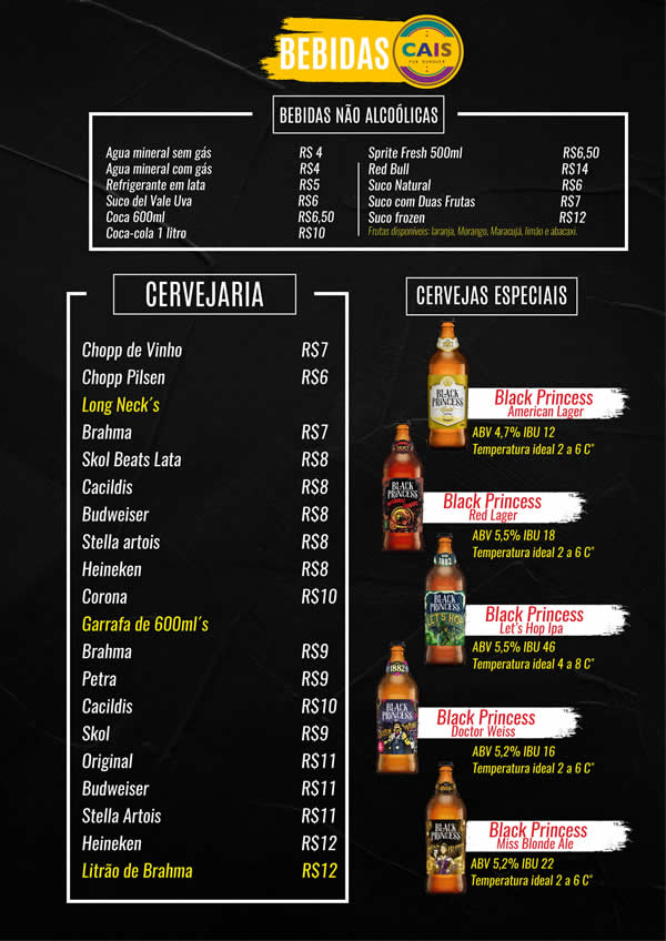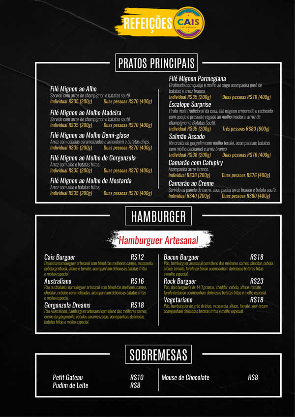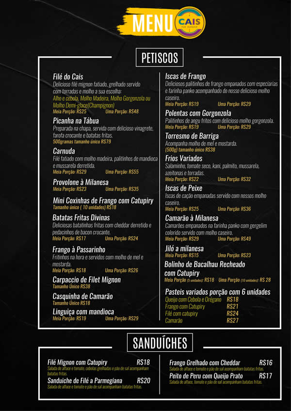 Com 20 anos de funcionamento, o Cais do Chopp é um dos restaurantes mais tradicionais de Muriaé. Confira o cardápio completo abaixo.