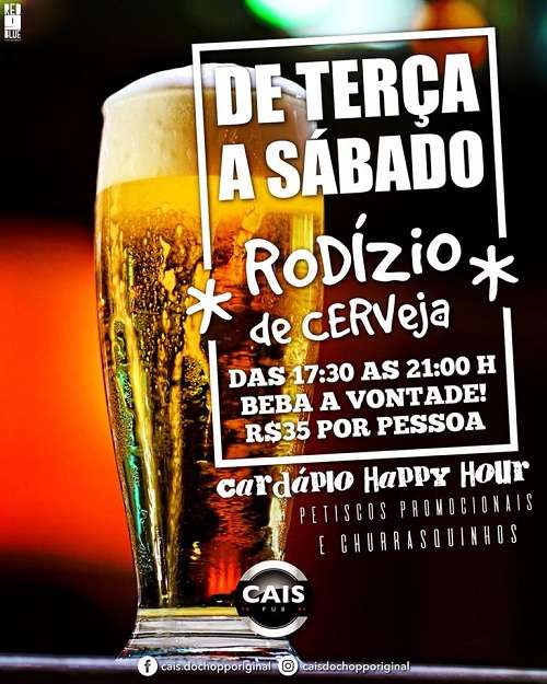 Além disso, o Cais do Chopp tem mais novidades: cardápio happy hour com petiscos promocionais e churrasquinhos, tudo com um “precinho” camarada!