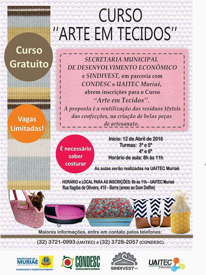 Estão abertas as inscrições para o curso gratuito de arte em tecidos em Muriaé. A proposta do curso é a reutilização dos resíduos têxtis das confecções para a criação de belas peças de artesanato. O curso terá início no dia 12 de abril, com duas turmas: uma as terças e quintas-feiras e outra as quartas e sextas-feiras. O horário das aulas será de 8 as 11h.
