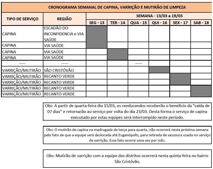 Para saber como está o cronograma de capina, varrição, limpeza e mutirão na semana em curso, clique na imagem abaixo: