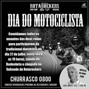 Em Muriaé, a concentração para a motociata acontece no Terminal Rodoviário e a saída está prevista para às 19h. Os motociclistas irão percorrer as principais vias da cidade até chegar a Sudsede do Rotarockers, no bairro João XXIII, onde será servido um churrasco e terá música ao vivo com Carlinhos Voz e Violão.