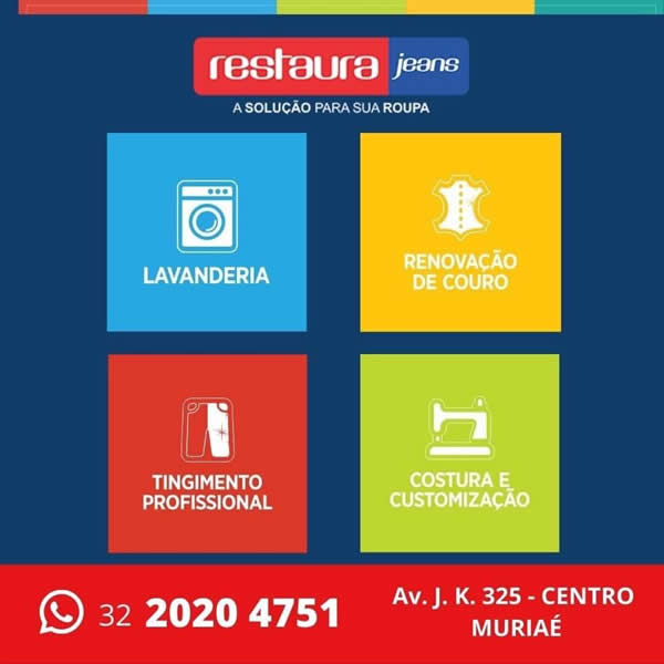 Muriaé agora já pode contar com uma empresa que oferece serviço completo de TINGIMENTO, COSTURA, LAVANDERIA e renovação de COURO tudo em um só lugar. A loja já está funcionando na Avenida JK, nº 325 no Centro. A Restaura Jeans é uma franquia com mais de 230 unidades em todo o Brasil.