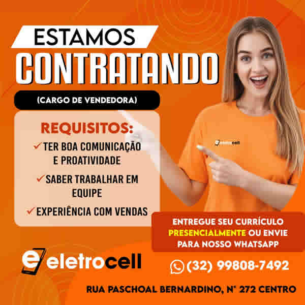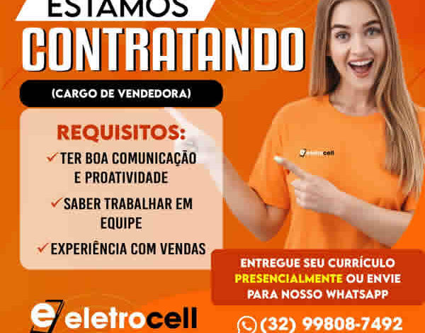 A Eletrocell, loja especializada em aparelhos celulares e eletrônicos, abriu oportunidades de emprego em Muriaé.