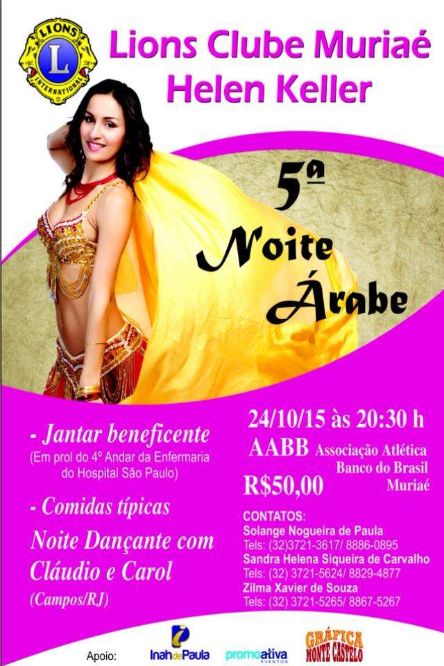 O Lions Clube Muriaé Helen Keller promove, no próximo sábado (24), às 20h30, na AABB, a 5ª Noite Árabe. O evento beneficente tem como objetivo angariar fundos que serão revertidos para o 4º andar da enfermaria do Hospital São Paulo. Os ingressos estão a venda por R$ 50,00.
