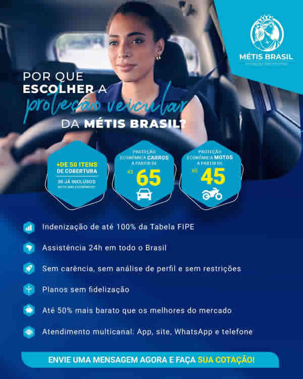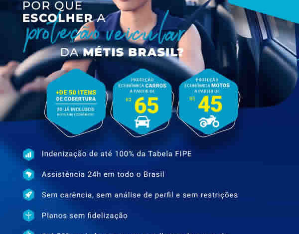 Essa combinação de benefícios, com preços a partir de R$ 114/mês, torna a Métis Brasil uma das opções mais competitivas para quem busca proteção veicular em em qualquer lugar do Brasil.