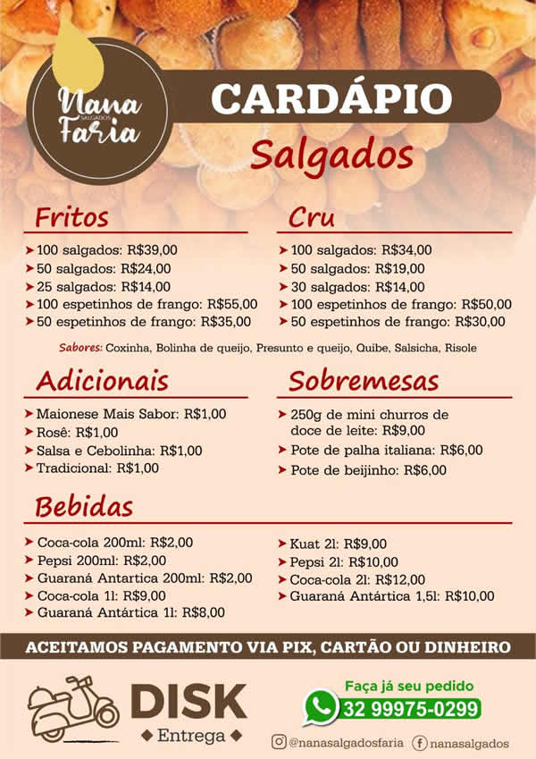 Para conferir o cardápio da Nana Salgados e fazer o seu pedido, acesse o link no iFood: https://menu.ifood.com.br/1c4c8d55-6318-4223-8543-6b09712be359. Muito mais rápido e fácil! Ficamos felizes com a sua preferência.