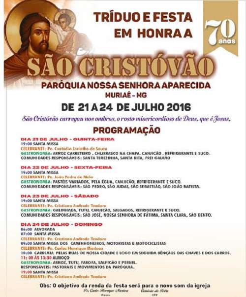 A Paróquia Nossa Senhora Aparecida, no Porto, divulgou a programação do Tríduo e Festa em Honra a São Cristovão, que acontece entre os dias 21 e 24 de julho de 2016.