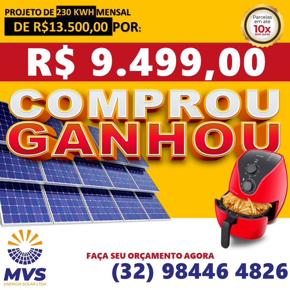 Projeto de energia solar de 230 kwh mensal de R$ 13.500,00 por apenas R$ 9.499,00! Além de um desconto de R$ 4 mil, comprando você ainda leva uma airfryer!