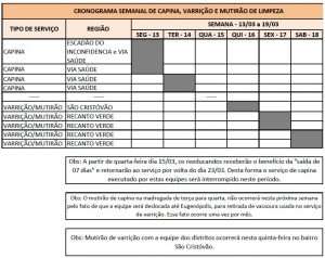 Para saber como está o cronograma de capina, varrição, limpeza e mutirão na semana em curso, clique na imagem abaixo: