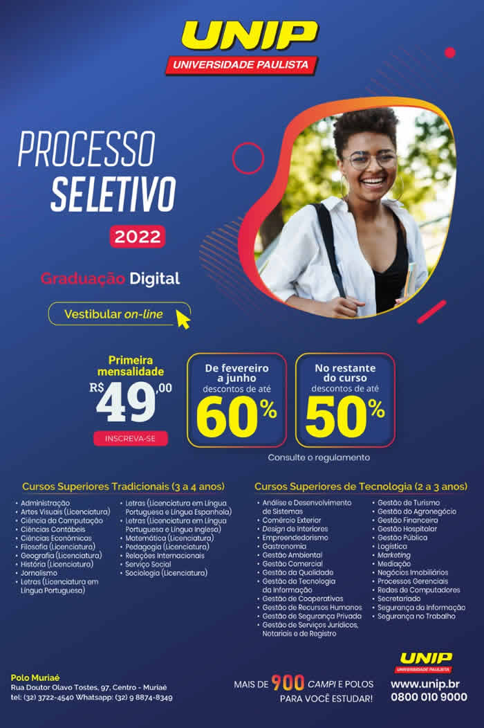 Aproveite os descontos dos cursos da UNIP Muriaé e inicie sua graduação no primeiro semestre de 2022!