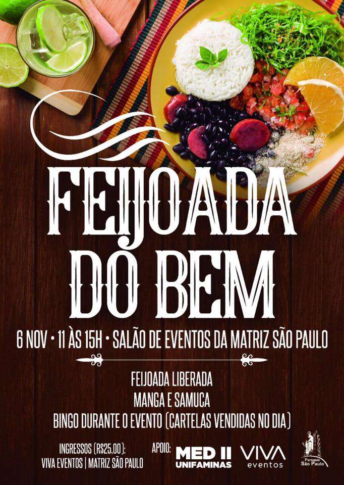 Acontece neste domingo (6), a partir das 11h, no salão de eventos da Matriz São Paulo, a “Feijoada do Bem”. Na programação, feijoada liberada, bingo durante o evento e música ao vivo com Manga e Samuca.