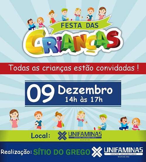 A tradicional Festa das Crianças, promovida pelo Sítio do Grego e Centro Universitário Unifaminas, levará alegria e diversão para milhares de crianças muriaeenses neste sábado (9), no Centro Universitário. O evento acontecerá de 14 às 17h.