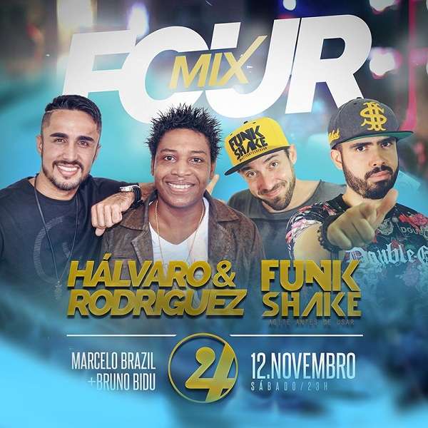 Uma mistura de ritmos para deixar sua noite ainda melhor. Em edição especial, a festa Four Mix traz atrações inéditas a casa. Hálvaro & Rodrigues com o melhor do sertanejo universitário e o projeto Funk Shake, comandado pelos renomados DJs Samurai e Tássio Duarte, com uma super apresentação áudio visual com efeitos, brindes e surpresas. Para completar a noite, os residentes comandam a pista sem hora pra acabar: DJs Marcelo Brazil Bruno Bidu. E para ficar melhor a sua noite, a entrada será convertida em consumação até 1h.
