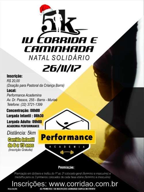 A 4ª Corrida e Caminhada Natal Solidário, promovida pela Prefeitura de Muriaé e Academia Performance, acontecerá neste domingo (26). A concentração acontecerá às 8h, na Avenida Doutor Passos, na Barra. O evento, cujo valor arrecadado será doado para a Pastoral da Criança do bairro, fomenta a prática esportiva e a solidariedade. A inscrição custa R$ 20,00 e pode ser feita no site www.corridao.com.br até no dia da Corrida.