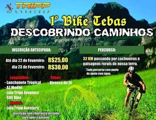 O 1º Bike Tebas será realizado no dia 23 de fevereiro, saindo da Praça de Tebas, distrito de Leopoldina, às 08h. O percurso de 32 Km será por estradas do distrito passando por cachoeiras.