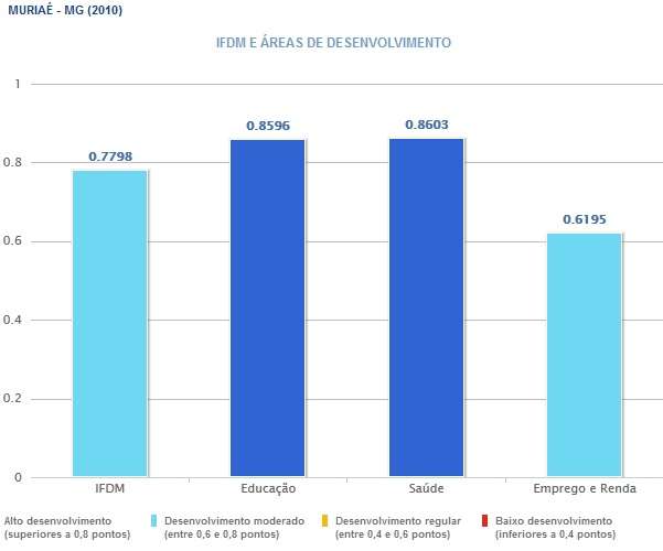 A cidade de Muriaé ocupa a 48ª posição na lista dos municípios mais desenvolvidos do Estado de Minas Gerais, ficando na 500ª posição a nível nacional. A cidade obteve 0.7798 pontos, o que significa um desenvolvimento moderado. Levando em consideração Emprego e Renda na cidade, o desenvolvimento é quase regular (veja o gráfico abaixo).