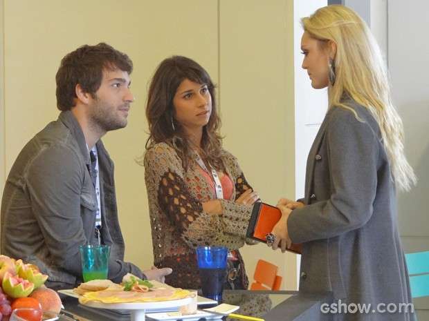 A patricinha mantem sua postura: “A little ressaca, mas vou ficar bem. Você pode vir comigo, Davi?”. Quem acompanha a resenha, toda enciumada é Manu, que solta fumaça pelo nariz. “Podemos conversar aqui? A gente tá esperando o pronunciamento do teu pai”, ele explica. A musa, toda trabalhada na elegância, concorda: “Sure! Vim agradecer, Davi. Você me defendeu daqueles caras! Você me salvou again!”, diz, toda animadinha fazendo questão de olhar para a namorada do bofe.