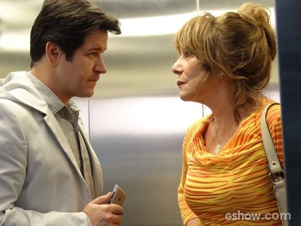 Malandro que só, o visionário da tecnologia resolve usar isso a seu favor e chantageia a picareta no melhor estilo. Ele tecla no celular e faz o elevador em que está com ela dar trancos, subindo e descendo. Claro que Gláucia já fica toda apavorada. “Agora eu tô no controle de novo. O vento mudou, mãezinha. Agora quem manda sou eu”, diz. O todo poderoso mostra as imagens do roubo e completa: