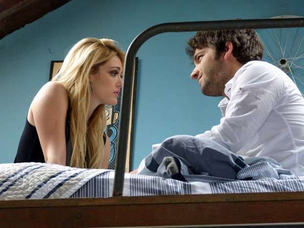 Vendo que ele está muito mal, Megan o leva para casa. Quando está saindo, ouve um pedido de Davi impossível de não atender: “Espera! Não me deixa sozinho, não. Fica mais um pouco”. Aí também é pedir demais para uma patricinha apaixonada, né? Megan tasca um megabeijo nele, que embarca. E quando ela pensa que sua parte acabou, Davi implora: “Fica aqui comigo”. Claro que a loira aceita na hora: “Eu posso ficar pra sempre aqui do seu lado, Davi Reis.”