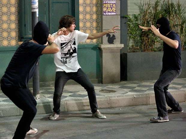 Disfarçando muito mal, ele vai para debaixo da sacada da Ka e começa a falar alto: “Eu não tenho medo de ficar aqui, exposto ao perigo… Sou destemido, viril”. Rominho e Luiz, então, aparecem disfarçados para atacar o líder da banda.