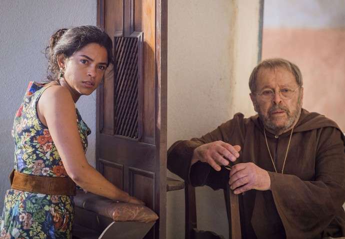 Os dois iniciam uma conversa sobre o que aflige o coração de Luzia, e a dona de casa decide, portanto, se confessar. Neste momento, quem aparece à porta da igreja é, justamente, Tereza. Ao ouvir a voz da inimiga, a mulher do fazendeiro se torna, com sangue nos olhos, e o religioso reapresenta uma a outra. “Esposa de Santo dos Anjos!”, a morena faz questão de destacar.