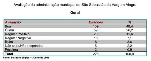 Na pesquisa realizada pelo Instituto Empec, no dia 16 de junho, em 220 domicílios, obteve-se o seguinte resultado para a pergunta: como você avalia a atual administração de São Sebastião da Vargem Alegre? Do total de entrevistados, 48,4 a classificaram como “boa”; 26,2 “ótima”; 11,6 regular, totalizando 86,2 os conceitos positivos. As avaliações negativas somaram apenas 11,6; os que não souberam responder 2,2%.