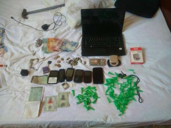 Na presença de uma testemunha, os militares iniciaram buscas pelo local e encontraram 26 pinos de cocaína, uma porção de maconha, um dichavador, material para endolo de drogas, duas balanças de precisão, 30 munições calibre 22 intactas, uma munição calibre 380 percutida, a quantia de R$ 183,00, diversos aparelhos celulares, um notebook, uma bicicleta, cinco capacetes e dois documentos de motocicletas.