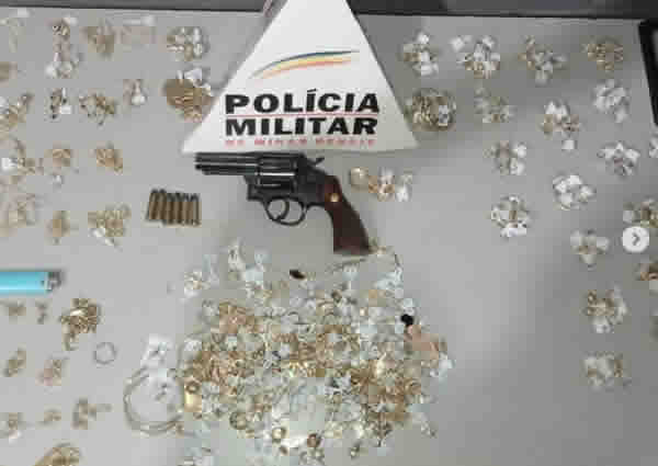 Após buscas pelo trajeto de fuga do suspeito, os policiais localizaram uma mochila, que continha em seu interior grande quantidade de joias, bijuterias e relógios, além de um revólver com seis munições intactas e uma balança de precisão.