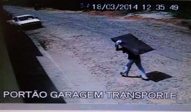 Imagens de câmeras de segurança registraram o homem bem vestido que circula de dia e com TVs nas costas por um longo trecho.