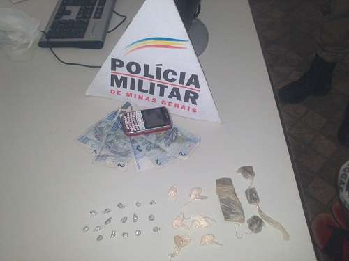 A Polícia Militar recebeu informações de que um jovem estaria traficando drogas na Rua Gaspar Zem. De imediato, a viatura Tático Móvel se deslocou para o local e observou a movimentação do suspeito, que deixava as drogas que traficava escondidas em um terreno baldio. O rapaz foi abordado pelos militares e no terreno foi encontrado 16 pedras de crack, 6 papelotes de cocaína, um tablete pequeno e 3 buchas de maconha, um celular e R$ 10,00.