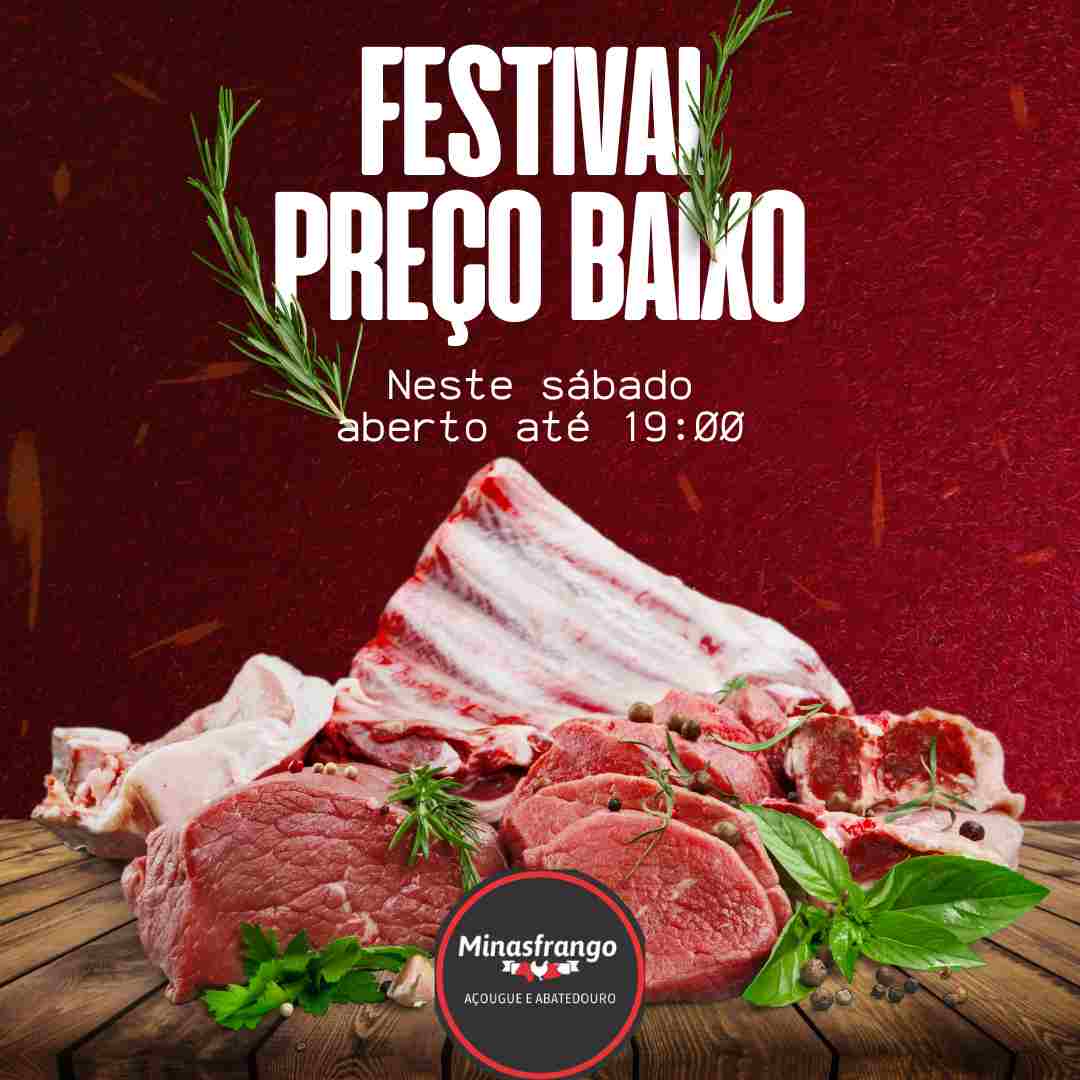 Além das promoções incríveis do açougue, o Minas Frango tem nos finais de semana incríveis refeições, como frango assado e outras carnes assadas para seu almoço. Experimente também a maionese, salpicão, farofa e salada. Hoje aberto até às 19:00.