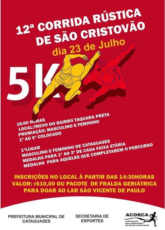 A 12ª Corrida Rústica de São Cristovão será realizada no próximo sábado (23) na cidade de Cataguases. Com percurso de 5 km, a saída está prevista para às 16h no trevo do bairro Taquara Preta.