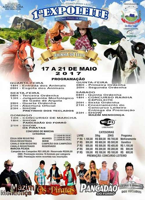O município de Antônio Prado de Minas estará em festa de 17 a 21 de maio em ocasião da 1ª Expoleite.