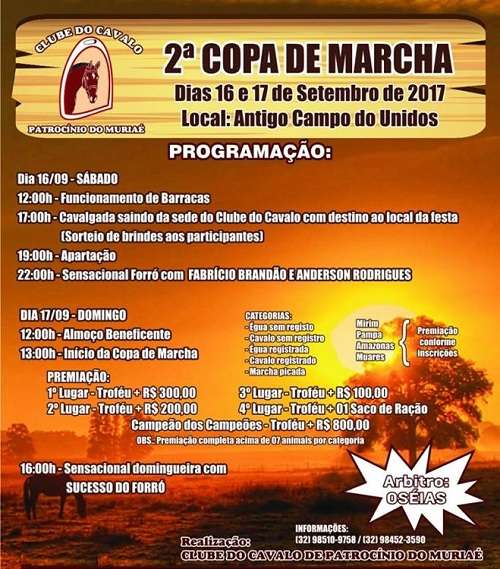 A 2ª Copa de Marcha do Clube do Cavalo de Patrocínio do Muriaé acontece entre os dias 16 e 17 de setembro no antigo campo do Unidos.