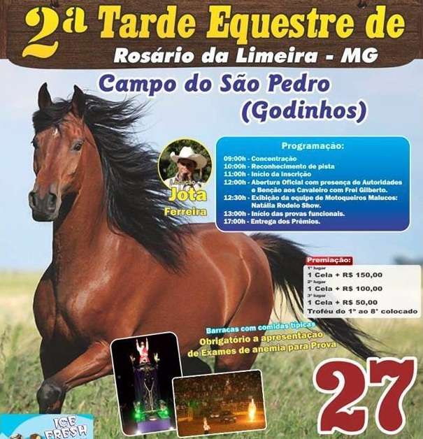 Será realizada, no próximo dia 27 de abril, a 2ª Tarde Equeste de Rosário da Limeira, no Campo do São Pedro (Godinhos). O evento terá provas funcionais de baliza e tambor. Locução de Jota Ferreira. Entrada franca.