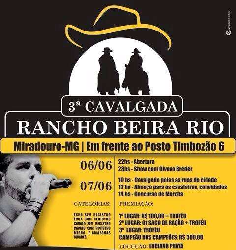 Será realizada, nos dias 6 e 7 de junho, em Miradouro, a 3ª Cavalgada Rancho Beira Rio. O evento será realizado no pátio do posto Timbozão 6.