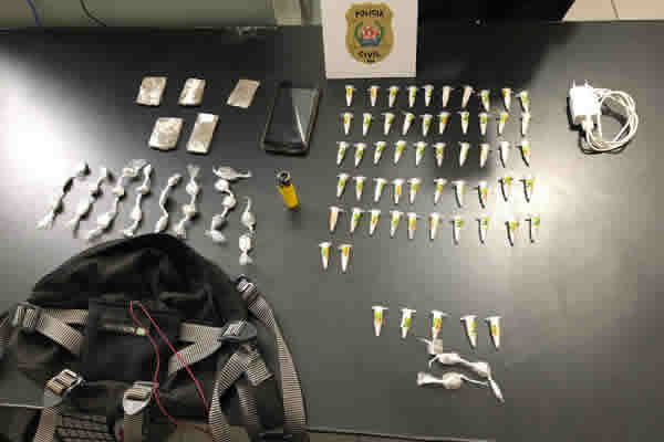 Os policiais civis também encontraram uma bolsa contendo 52 pinos de cocaína, 24 buchas e cinco tabletes de maconha.