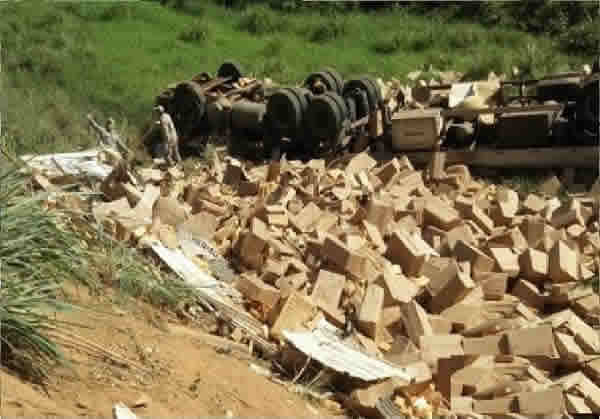 Por motivos ainda desconhecidos, a carreta, que estava transportando chocolates da empresa Garoto, saiu da pista, desceu por uma ribanceira e tombou. A cabine do veículo ficou totalmente destruída.