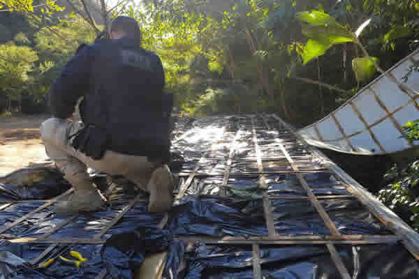 Em buscas minuciosas realizadas no caminhão, os agentes encontraram um fundo falso no teto do baú, de onde foram retirados cerca de 600 tabletes de maconha.