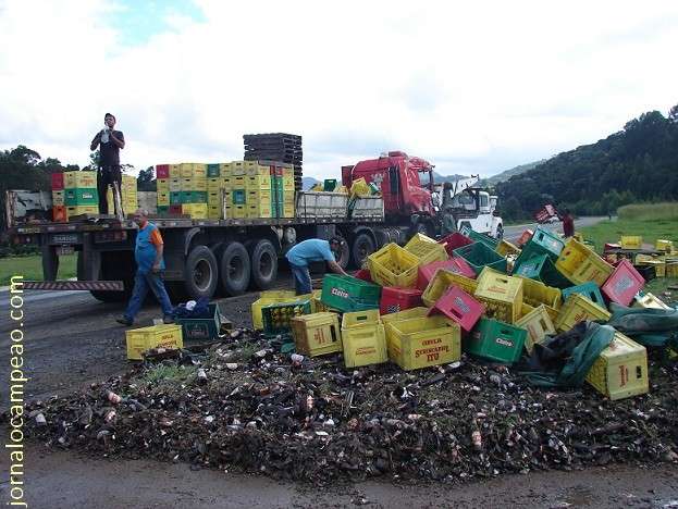De acordo com a Polícia Rodoviária Federal, mais de 70% da carga foi saqueada e o restante vazou na pista com a destruição de várias caixas de cerveja e garrafas de vidro.
