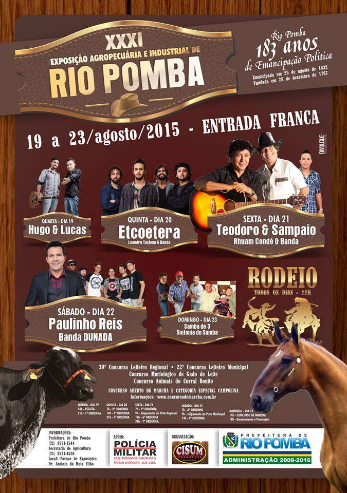 Será realizada, entre os dias 19 e 23 de agosto de 2015, a 31ª Exposição Agropecuária e Industrial de Rio Pomba. A entrada é franca todos os dias.