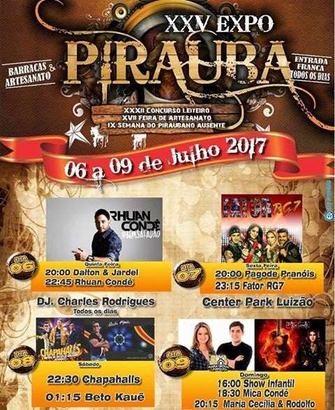 A 27ª Exposição Agropecuária de Piraúba será realizada entre os dias 6 e 9 de julho com entrada é franca todos os dias.