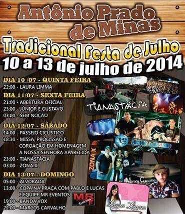 Divulgada a programação da Tradicional Festa de Julho de Antônio Prado de Minas 2014