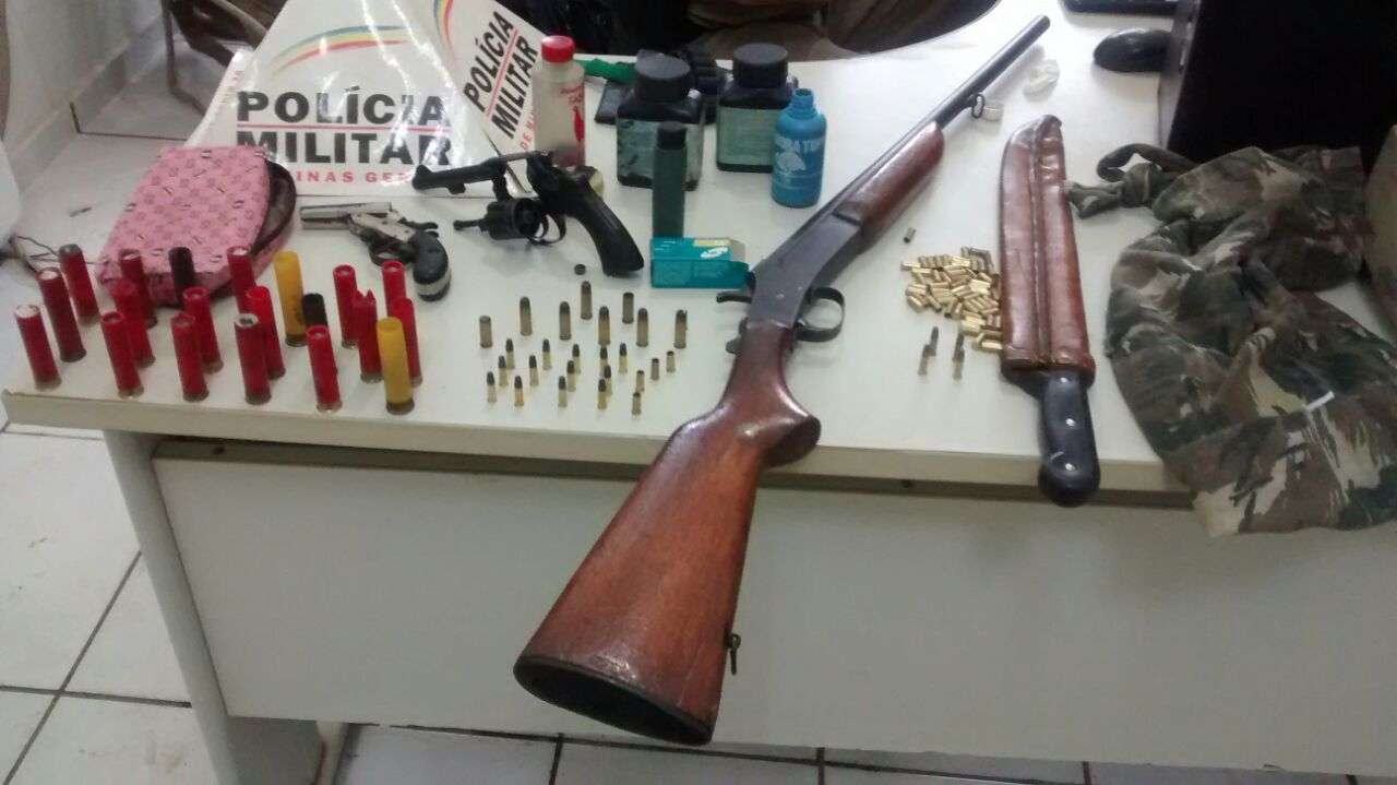 Após buscas, os policiais lograram êxito em apreender três armas de fogo (uma garrucha, um revólver e uma espingarda), além de munições de diversos calibres e um facão.