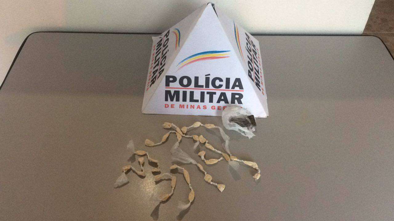 Após varredura nos arredores, foi localizado, a menos de cinco metros dos abordados, uma garrafa pet, contendo em seu interior 32 invólucros de cocaína, e uma sacola. com duas buchas pequenas de maconha.