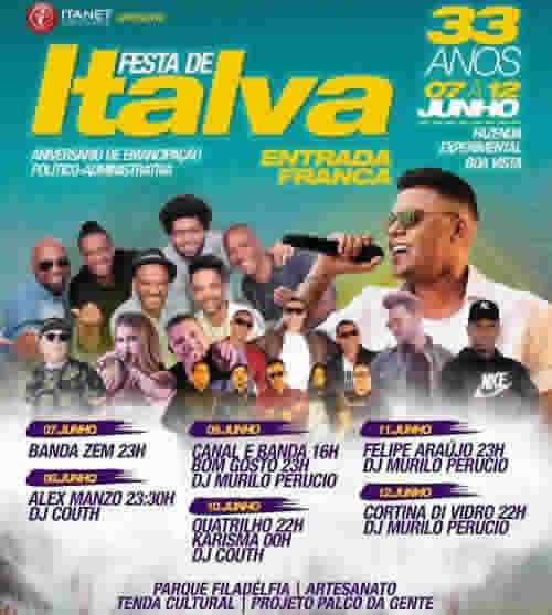 A Festa de Italva acontece entre os dias 07 e 12 de junho, na Fazenda Experimental Boa Vista. A entrada é franca todos os dias.