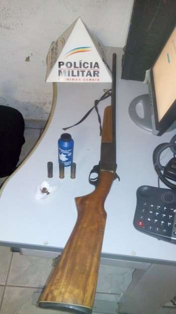 Foi procedida busca pessoal no condutor e no passageiro, não sendo localizado nada ilícito em poder dos mesmos. Ao ser realizado busca no interior do veículo, foi encontrada uma espingarda calibre 28, três cartuchos deflagrados, espoletas, pólvora e uma bucha de maconha. Questionados, o condutor assumiu a propriedade da arma de fogo.