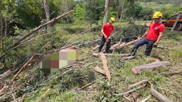 Ao chegarem ao local, os bombeiros constataram que a vítima estava esmagada sob o tronco de um eucalipto de aproximadamente 30 metros de altura, que havia sido suprimido. Foi preciso o uso de motosserras e equipamentos de proteção individual (EPI) para realizar os cortes necessários no tronco e conseguir liberar o corpo.