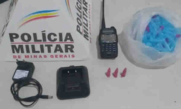 Ele foi abordado e submetido à busca pessoal, sendo encontrado com o mesmo um rádio comunicado HT na frequência da Polícia Militar, uma base carregadora de bateria de HT, três pinos de cocaína e outros 170 pinos vazios.