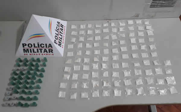 Foram apreendidos um total de 104 papelotes de cocaína, embalados individualmente em plástico transparente, e 49 frascos de plástico com maconha. Com a mulher ainda foram encontrados mais dois invólucros plásticos contendo frascos de plástico com maconha e um celular.